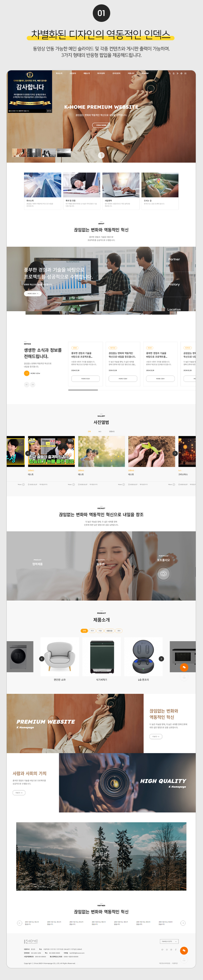 기업 풀반응형 테마_kt001 수정범위하단 수정범위 참조 도 메 인1년 무상제공 호 스 팅1년 무상제공 [하드3기가/트래픽3기가]1년후 년 11만원[부가세포함] 이 미 지게티이미지뱅크 사용 기본작업10페이지 기준 담 당 자010-4760-8134 / design240@naver.com 기본비용880,000원 * 디자인 요구사항에 따라 견적이 다를 수 있습니다. 상담/견적문의 데모사이트 상세정보 목록